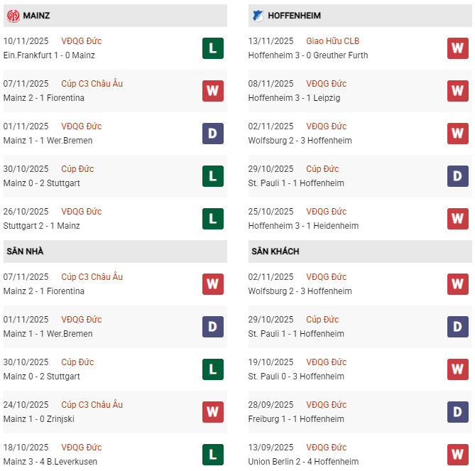 Thống kê đối đầu Mainz vs Hoffenheim: