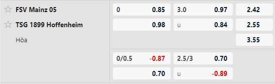 Thông tin tỷ lệ bóng đá Mainz vs Hoffenheim: