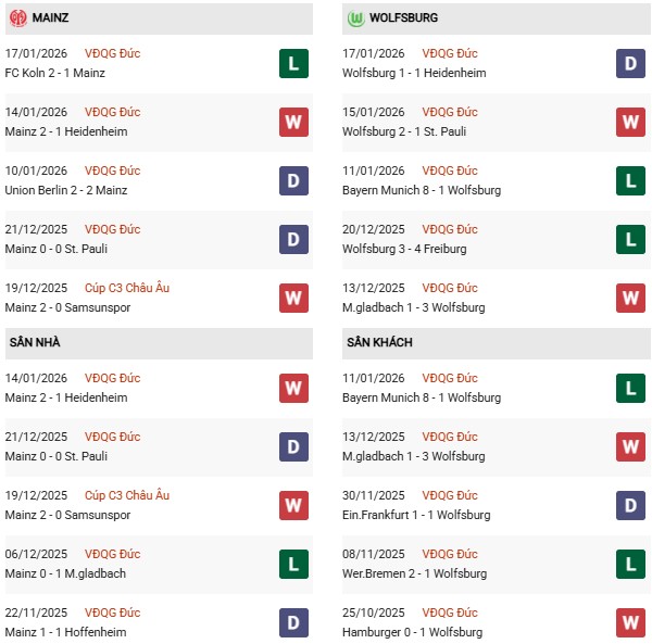 - Trên sân nhà, Mainz thắng 2, thua 3 trước Wolfsburg.