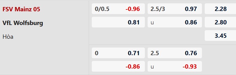 Thông tin tỷ lệ bóng đá Mainz vs Wolfsburg: