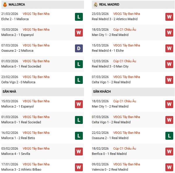 Thống kê phong độ Mallorca vs Real Madrid: