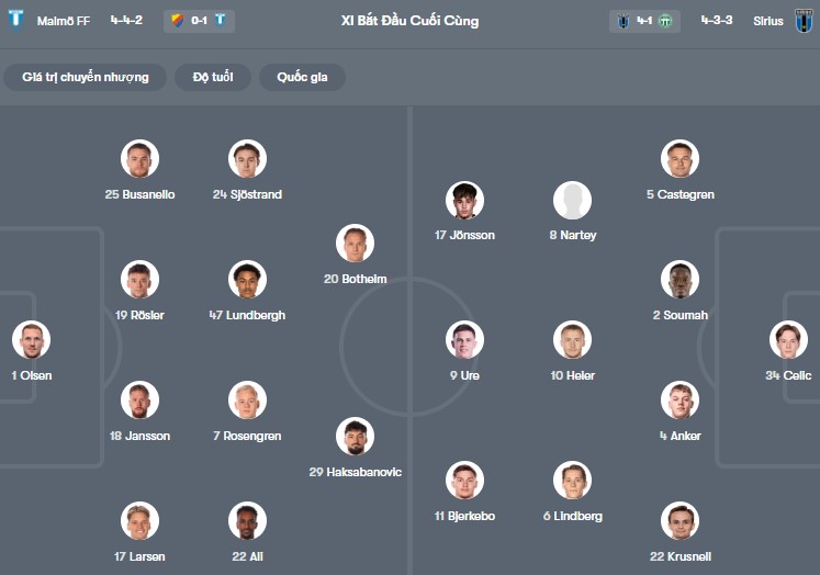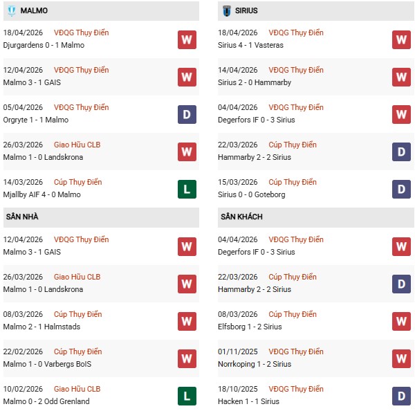 - Malmo thắng 6, hòa 1, thua 3 trong 10 trận gặp Sirius gần đây.
