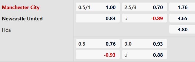 Thông tin tỷ lệ kèo bóng đá Man City vs Newcastle: