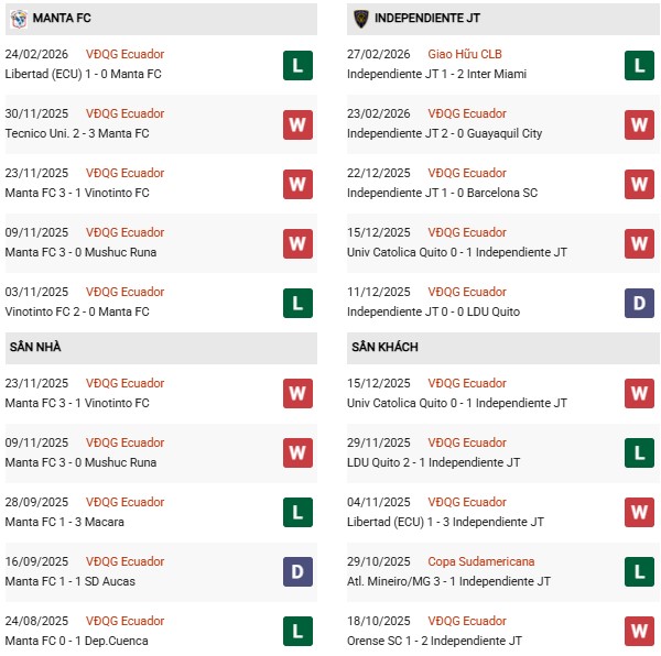 - Manta thắng 2, hòa 3, thua 5 trong 10 trận gặp Independiente del Valle gần đây.