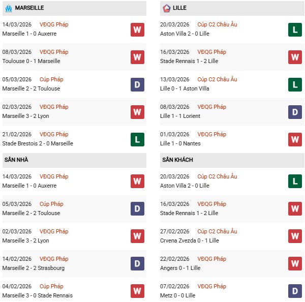Thống kê phong độ Marseille vs Lille: