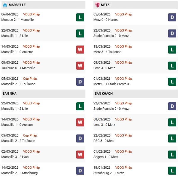 Thống kê phong độ Marseille vs Metz: