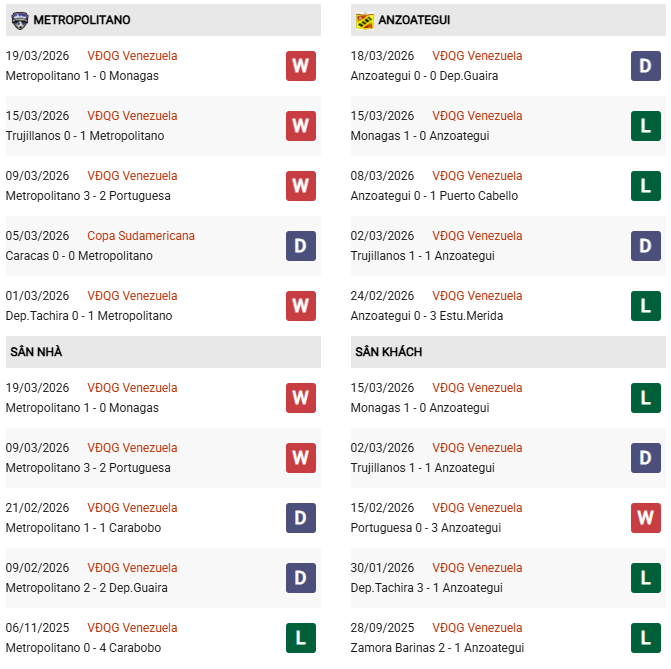 "Cái dớp" đối đầu: Một chi tiết cực kỳ quan trọng là trong 2 lần gặp nhau gần nhất vào năm 2025, Metropolitanos toàn thua trước Anzoategui FC (thua 1-2 và 1-3). Điều này cho thấy Anzoategui FC có lối chơi rất "kỵ rơ" với đội chủ nhà dù vị trí trên bảng xếp hạng hiện tại rất chênh lệch (Hạng 3 so với Hạng 13).