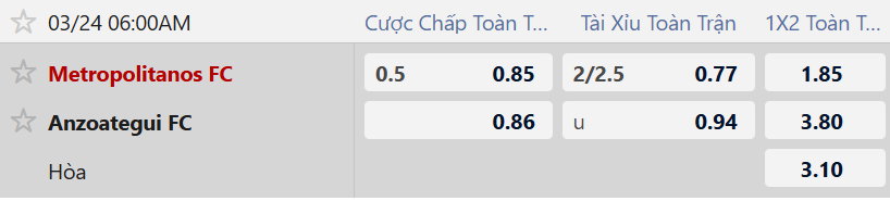 Thông tin tỷ lệ bóng đá Metropolitanos vs Anzoategui FC: