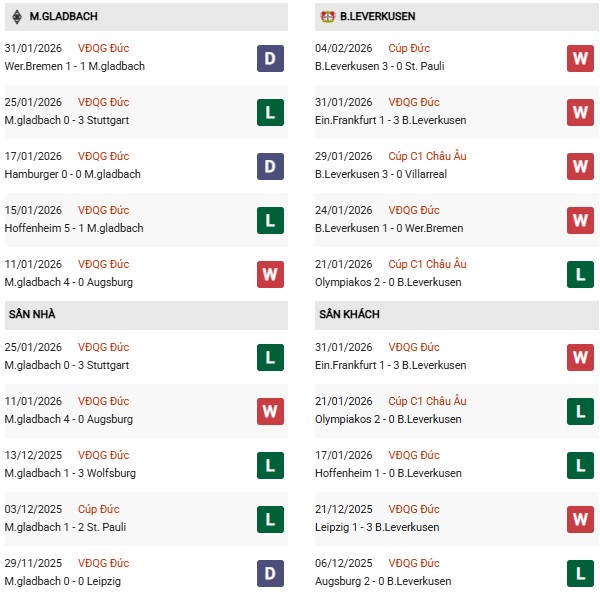 Thống kê phong độ M'Gladbach vs Leverkusen: