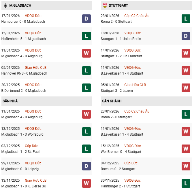 Thống kê phong độ M'Gladbach vs Stuttgart: