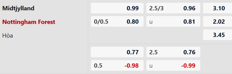 Dù phải làm khách, Nottingham vẫn được xếp cửa trên với mức chấp 1/4 bàn. Midtjylland đang có lợi thế dẫn bàn và được chơi trên sân nhà, nơi họ thường thi đấu rất kỷ luật. Trong khi đó, Nottingham Forest buộc phải dâng cao tìm bàn thắng, điều này dễ khiến họ rơi vào thế trận bất lợi trước lối chơi phản công của đối thủ. Với cục diện hiện tại, Midtjylland đủ khả năng bảo toàn lợi thế hoặc ít nhất không thua.