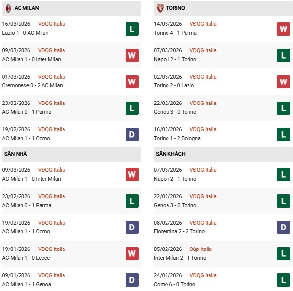 - Milan thắng 4, hòa 3, thua 3 trong 10 trận gặp Torino gần đây.