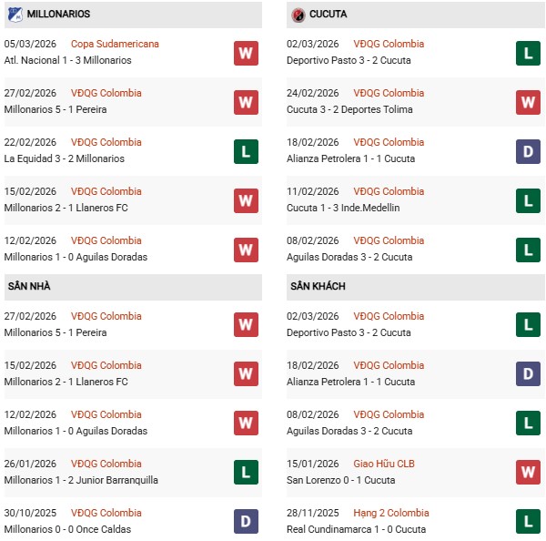 Thống kê phong độ Millonarios vs Cucuta: