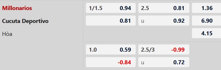 Thông tin tỷ lệ Millonarios vs Cucuta: