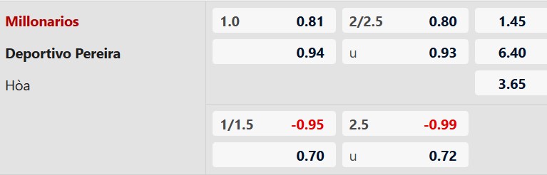 Thông tin tỷ lệ Millonarios vs Pereira: