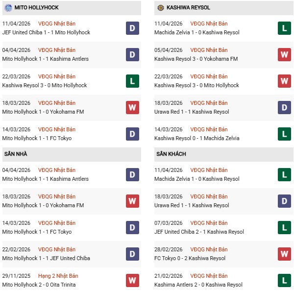 - Trên sân nhà, Mito Hollyhock thắng 1, thua 3 trước Kashiwa.