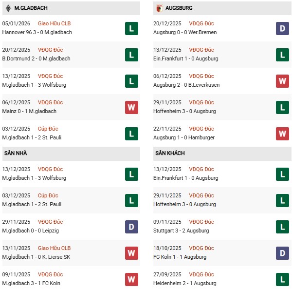 - Monchengladbach thắng 2, hòa 2, thua 6 trong 10 trận gặp Augsburg gần đây.