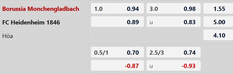 Thông tin tỷ lệ Monchengladbach vs Heidenheim: