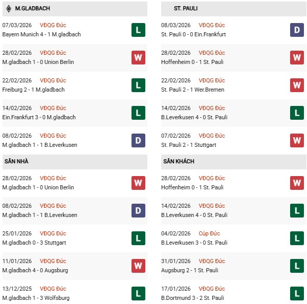 Thống kê phong độ Monchengladbach vs St Pauli: