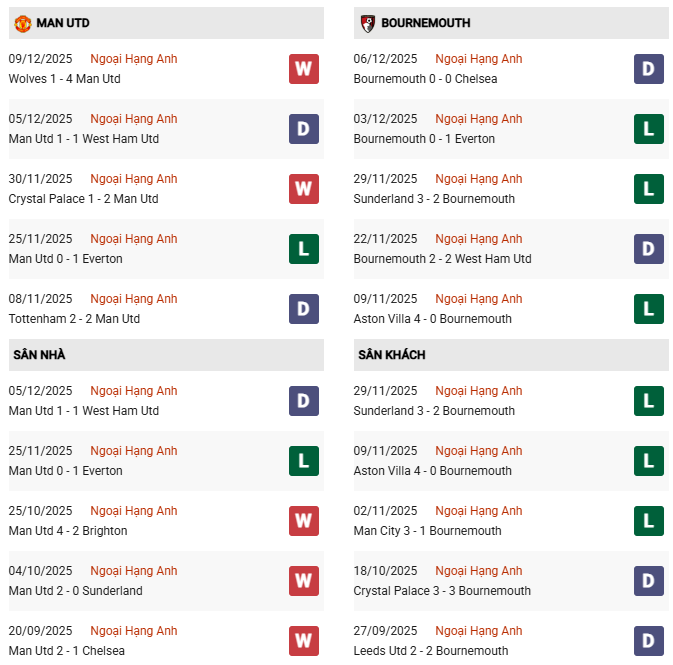 - 5 lần gần nhất gặp nhau, MU thua 2 hòa 2 và thua 1 trước Bournemouth.