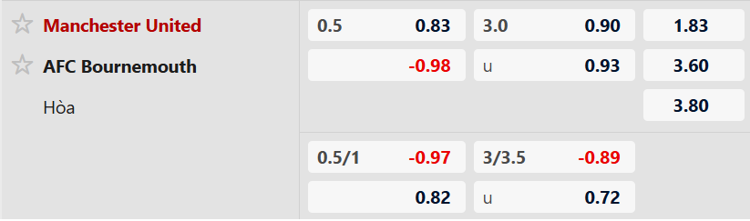 Thông tin tỷ lệ kèo MU vs Bournemouth: