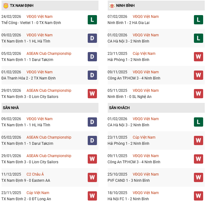 - Nam Định toàn thua cả 2 trận đối đầu Ninh Bình gần đây.