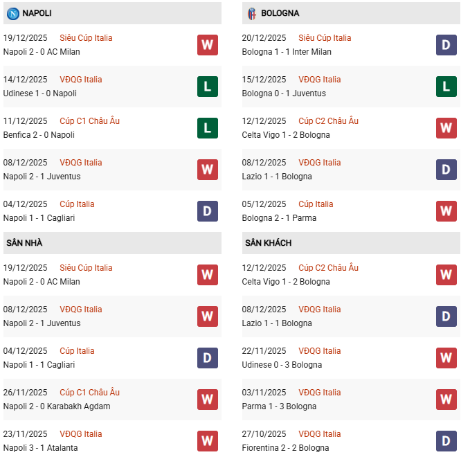- Napoli thắng 5, hòa 3, thua 2 trong 10 trận gặp Bologna gần đây.