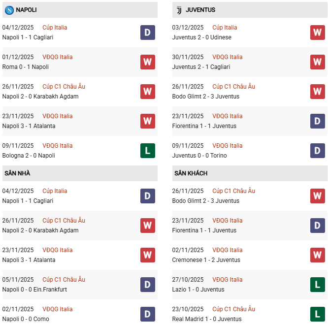Hàng công của Napoli đang chơi tốt khi ghi bàn 4 trong 5 trận gần nhất trong đó có 3 trận ghi trên 2 bàn.Hàng thủ của họ chơi khá ổn khi giữ sạch lưới 2/5 trận gần nhất.Bên kia chiến tuyến, Juventus đã ghi bàn 4 trong 5 trận gần đây, trong đó cũng có 3 trận ghi được 2 bàn. Hàng thủ của họ đã thủng lưới cả 3 trong 5 trận gần đây và giữ sạch lưới được 2/5 trận.