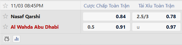 Không có gì ngạc nhiên khi Al Wahda đang được đánh giá cao hơn dù thi đấu xa nhà, tỷ lệ kèo được niêm yết ở mức 1/2 bàn. 7/8 trận gần nhất đội bóng này đều mang về niềm vui cho các nhà đầu tư. Trong khi 8 trận liên tiếp của Nasaf Qarshi chỉ 1 lần thắng kèo nên có thể đội khách là chọn lựa uy tín.