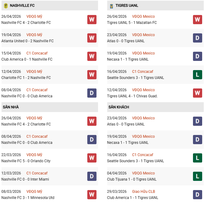 Thống kê phong độ Nashville vs Tigres UANL:
