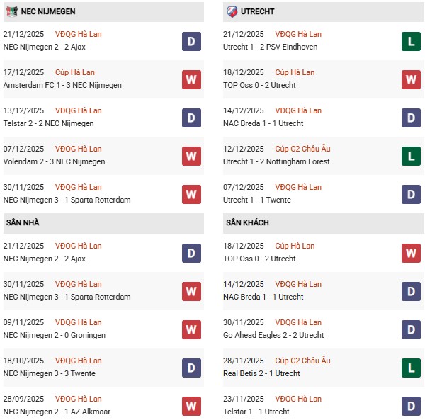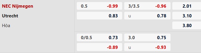 Phong độ dạo gần đây của Utrecht ở giải VĐQG Hà Lan không tệ: vẻn vẹn 1 thất bại sau 7 vòng (cũng trắng tay trước PSV Eindhoven) song trận thua lại nằm ở hôm duy nhất phải "nằm dưới" như hôm tới. Đây là điểm then chốt nữa khiến giới chuyên môn càng dành thiện cảm cho NEC trận này. Thống kê còn chỉ ra từ đầu mùa 2025/26 tới giờ, FC Utrecht thua sạch sẽ toàn bộ chuyến hành quân bị đánh giá thấp hơn đội chủ nhà (tối thiểu +1/4).
