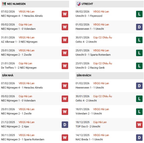 - NEC Nijmegen thắng 2, hòa 2, thua 6 trong 10 trận gặp Utrecht gần đây.