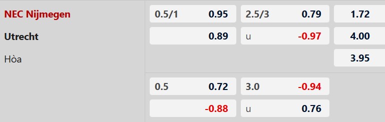 NEC Nijmegen chấp 3/4 bàn, phản ánh rõ sự chênh lệch về phong độ cũng như mục tiêu thi đấu giữa hai đội. NEC Nijmegen đang duy trì trạng thái thăng hoa, đặc biệt khi được chơi trên sân nhà, trong khi Utrecht lại sa sút thấy rõ cả về tinh thần lẫn lối chơi. Với quyết tâm giành trọn 3 điểm để vươn lên vị trí thứ 2 trên BXH, đội chủ nhà nhiều khả năng sẽ chủ động đẩy cao đội hình và tạo ra khác biệt để thắng trận.