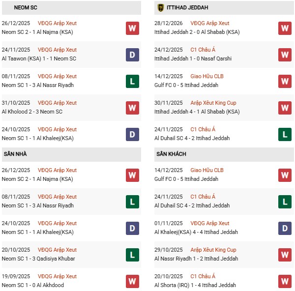 Cụ thể, Al Ittihad thắng 7, hòa 1 và chỉ thua 2 trong 10 trận gần nhất. Trên sân khách, họ cũng duy trì sự ổn định với 6 chiến thắng, 2 trận hòa và 2 thất bại trong 10 chuyến hành quân gần đây. Lối chơi tấn công tốc độ, khả năng tận dụng cơ hội tốt giúp Al Ittihad thường xuyên ghi nhiều bàn, đặc biệt khi gặp các đội sẵn sàng chơi cởi mở như Neom.