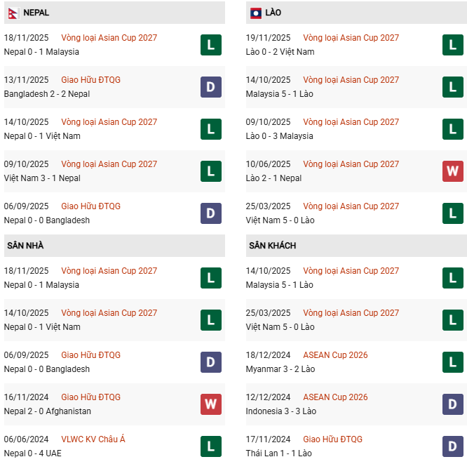 Thống kê phong độ Nepal vs Lào: