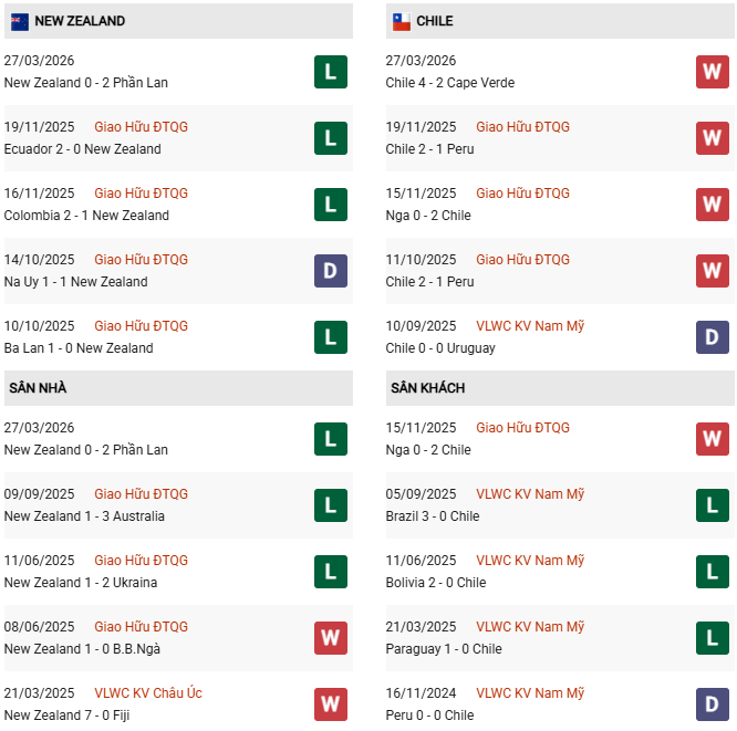 Thống kê phong độ New Zealand vs Chile:
