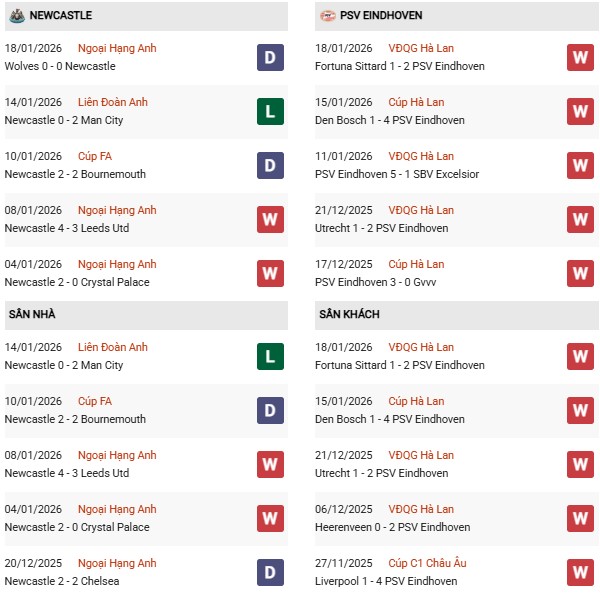 - Newcastle thắng 1, hòa 3, thua 1 trong 5 trận đối đầu PSV gần đây.