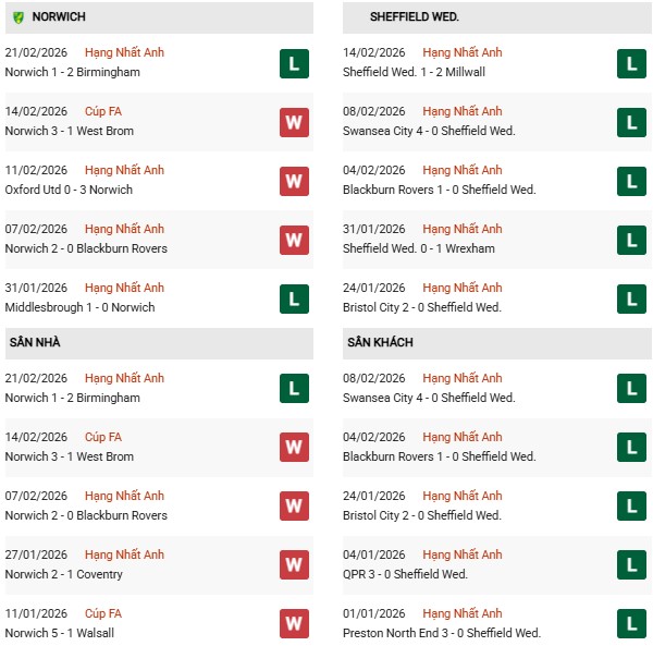 Thống kê phong độ Norwich vs Sheffield Wed: