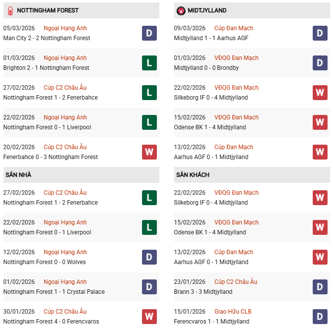 - Lần gặp nhau gần nhất Nottingham thua 2-3 trước Midtjylland.