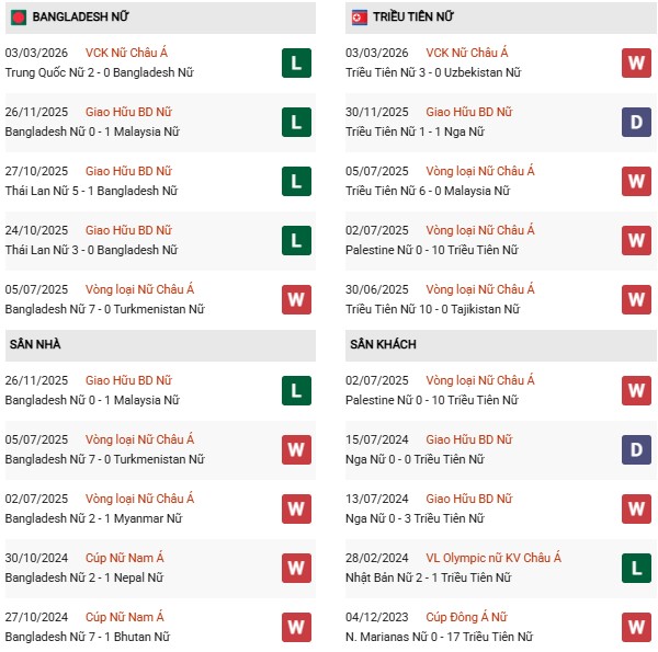 Thành tích đối đầu Nữ Bangladesh vs Nữ Triều Tiên: