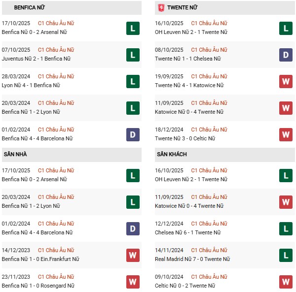 Thành tích đối đầu Nữ Benfica gặp Nữ Twente: