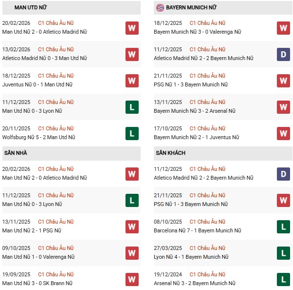 Thống kê phong độ Nữ MU vs Nữ Bayern Munich: