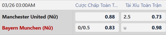 Thông tin tỷ lệ bóng đá Nữ MU vs Nữ Bayern Munich: