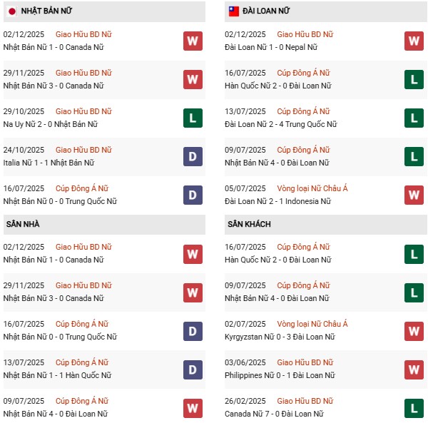 - Nữ Nhật Bản toàn thắng cả 8 trận đối đầu Nữ Đài Bắc Trung Hoa gần đây.
