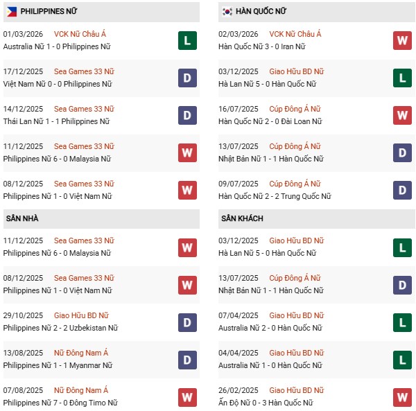Thống kê phong độ Nữ Philippines vs Nữ Hàn Quốc: