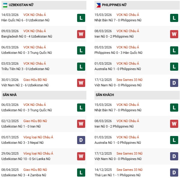 Thống kê phong độ Nữ Uzbekistan vs Nữ Philippines: