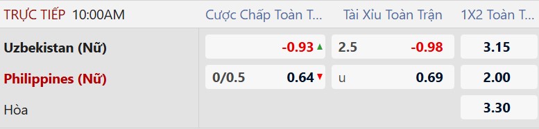 Thông tin tỷ lệ Nữ Uzbekistan vs Nữ Philippines:
