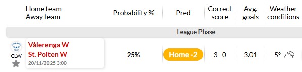 Dù Nữ St. Polten thiên về phòng ngự, nhưng hàng thủ của họ không còn chắc chắn như trước và dễ mắc lỗi trước sức ép lớn, minh chứng là 6/7 trận đấu vừa qua của đội khách đều có từ 3 bàn thắng trở lên. Trong khi đó, Valerenga trên sân nhà thường chơi tấn công mạnh mẽ, tạo nhiều cơ hội ăn bàn. Khả năng trận đấu có từ 3 bàn trở lên là rất cao và kèo Tài sáng cửa.