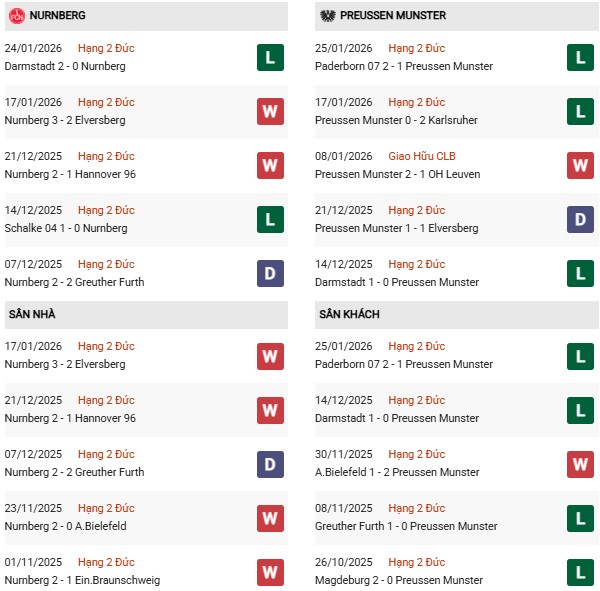 - Nurnberg thắng 2, thua 1 trong 3 trận gặp Preussen Munster gần đây.