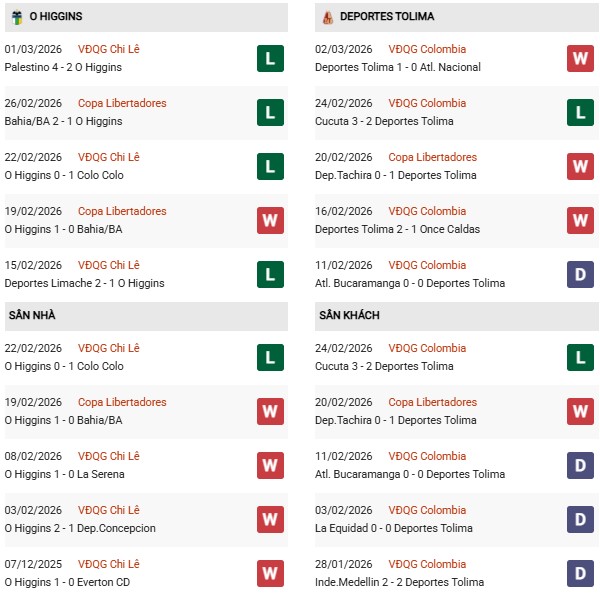 14 chuyến hành quân gần nhất trên mọi đấu trường, đại diện Colombia chỉ 2 lần nhận thất bại dù quá nửa số cuộc chơi họ phải "nằm dưới". Hơn nữa Tolima còn ăn đứt O Higgins về mặt kinh nghiệm lẫn bản lĩnh tại sân chơi châu lục vì thường xuyên được góp mặt. Vì vậy trước mắt ở lượt đi sắp tới, hoàn toàn có thể tin tưởng vào kịch bản Tolima không thua.